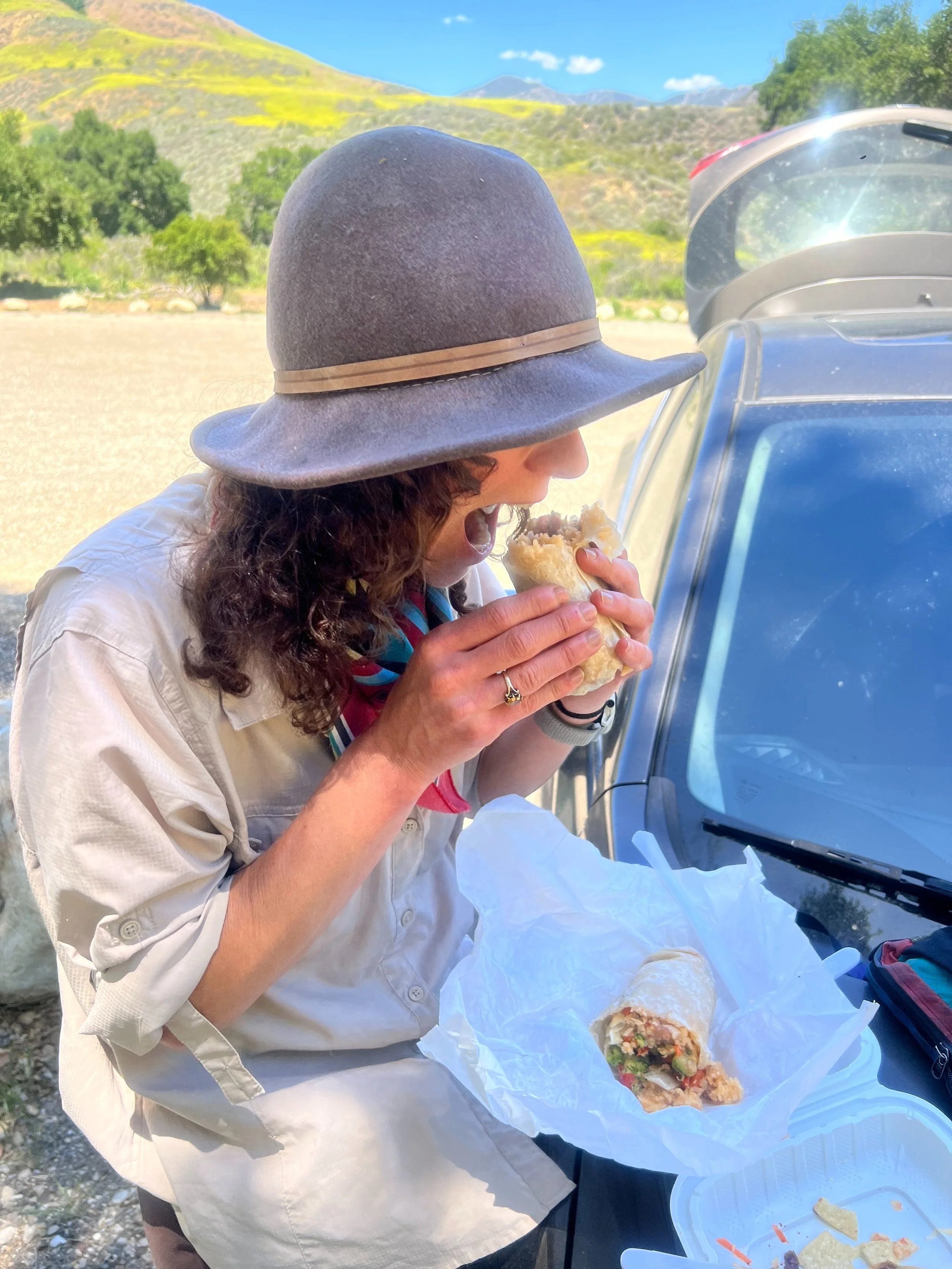 Nothing says hiker hunger like collapsing in a hot ditch and sucking down soy sauce packets and spoonfuls of nutritional yeast. I’m hot, exhausted, and starving. It’s 5 p.m., but the sun still feels like it’s blasting full force. I need a break, so I pull over at Tinta Creek, still just a dry drainage, and Cosmo joins me without hesitation. We find a tiny patch of shade under a small bush, lean against the sand and rocks, and collapse onto them, using our packs as backrests. We’re about 10 miles from our first food cache and I’m officially out of snacks. I feel grateful when Cosmo shares some of his mixed nuts and bars. I dig through my food bag for anything that’ll keep me going. I find a nearly full bag of nutritional yeast, stick my spoon in, and taste it. “Not bad,” I say to Cosmo. Before long, we’re just eating it by the spoonful. Then I find a couple soy sauce packets in my bag. “Save those for dinners,” Cosmo says. I pause for a second and consider his words, then rip one open and suck down the salty brown liquid. “This is amazing.” And I meant it. I hand Cosmo the other packet, and he agrees.