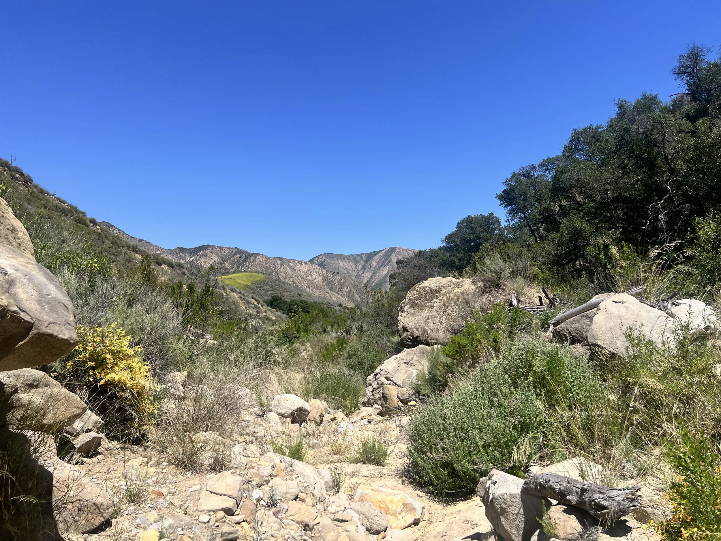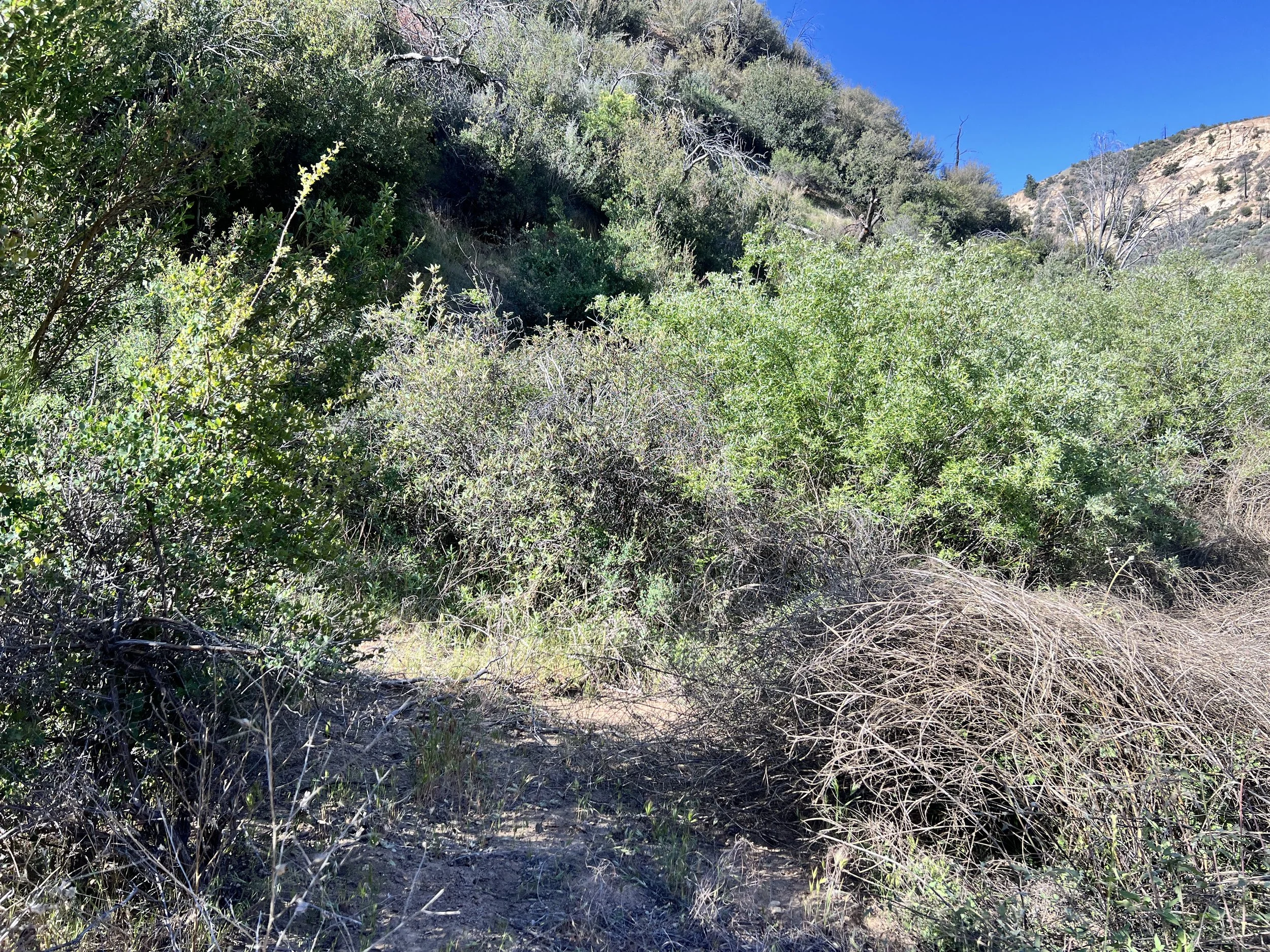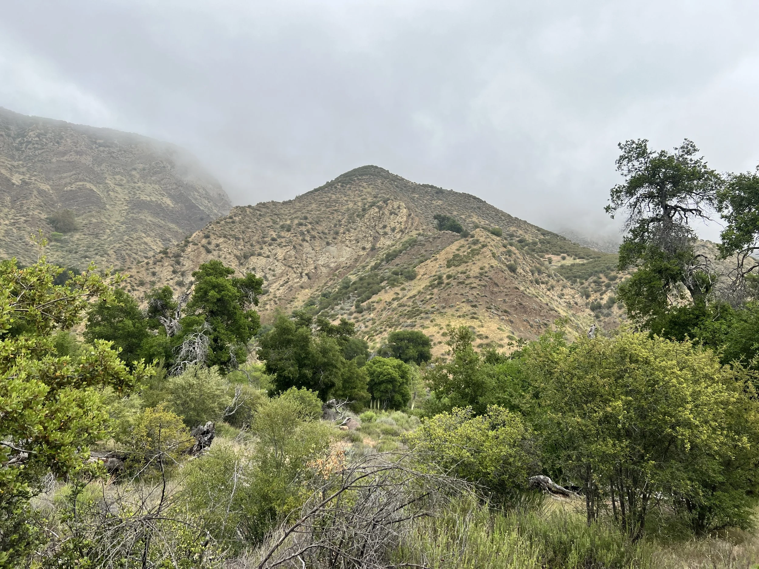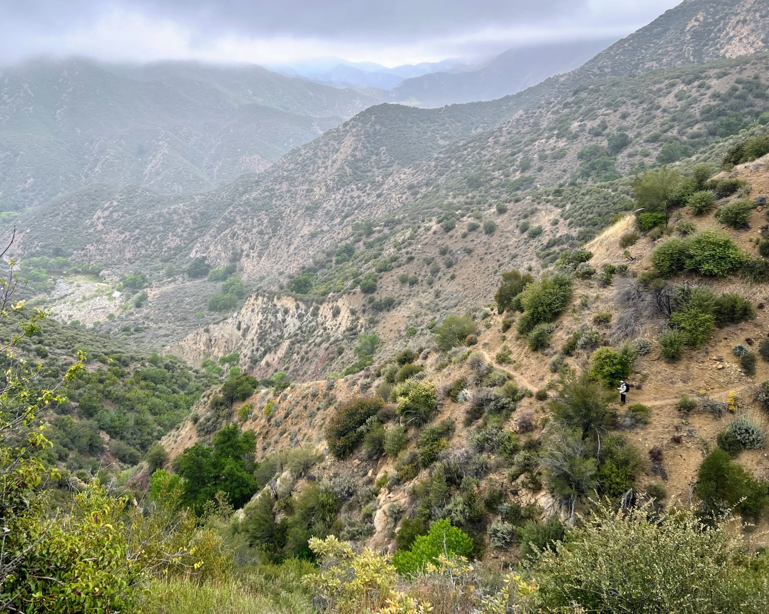 From the saddle we descend into Deal Canyon. I enjoy the presence of an actual trail, but I know not to get too attached; in true Condor Trail fashion, it eventually fades into a bushwhack. The clear path slowly narrows, the well-trodden dirt replaced by patches of tangled brush and scattered rocks. Branches scrape against my arms as I push forward, the scent of wild sage escaping the brush while chamise pollen scatters, dusting my face.