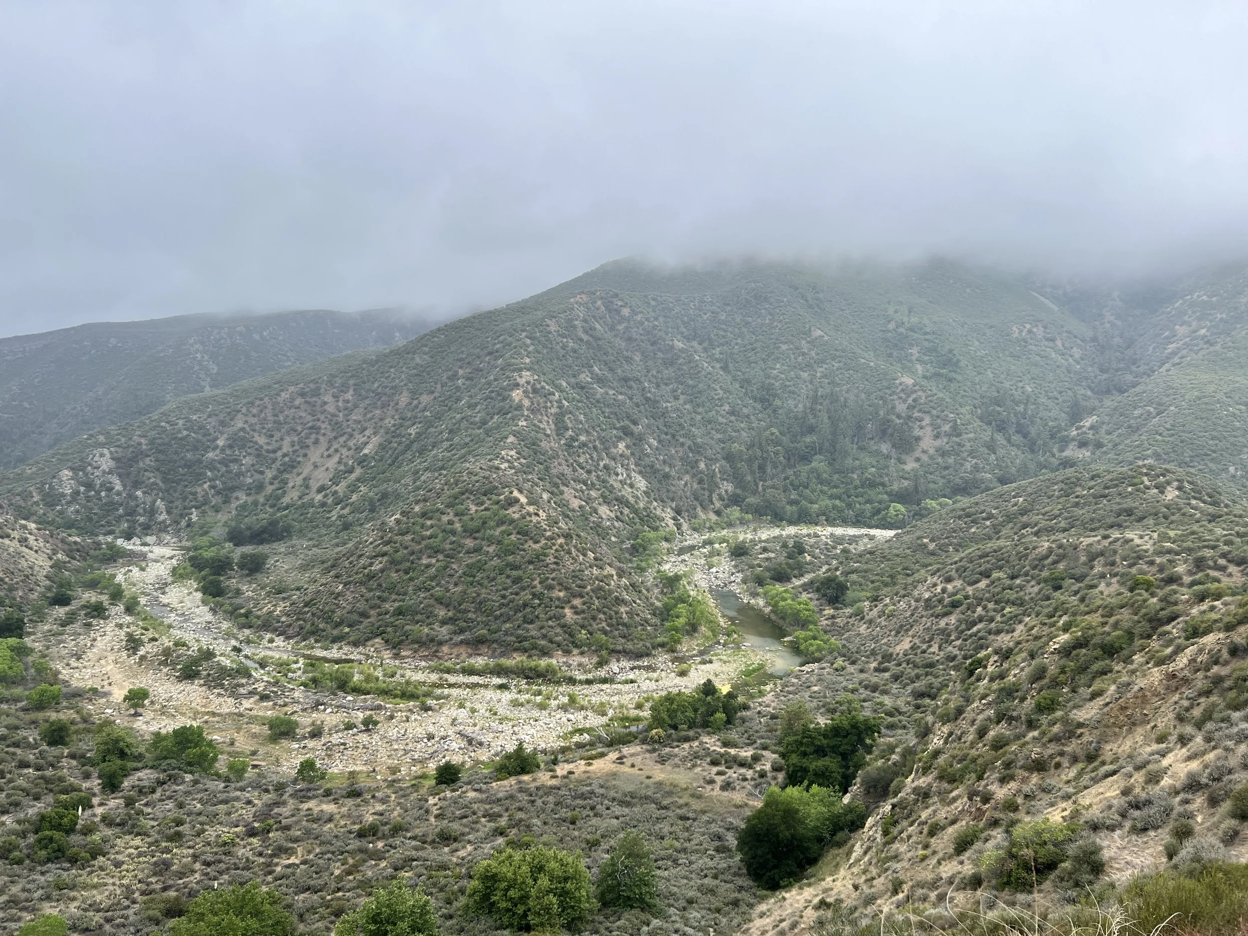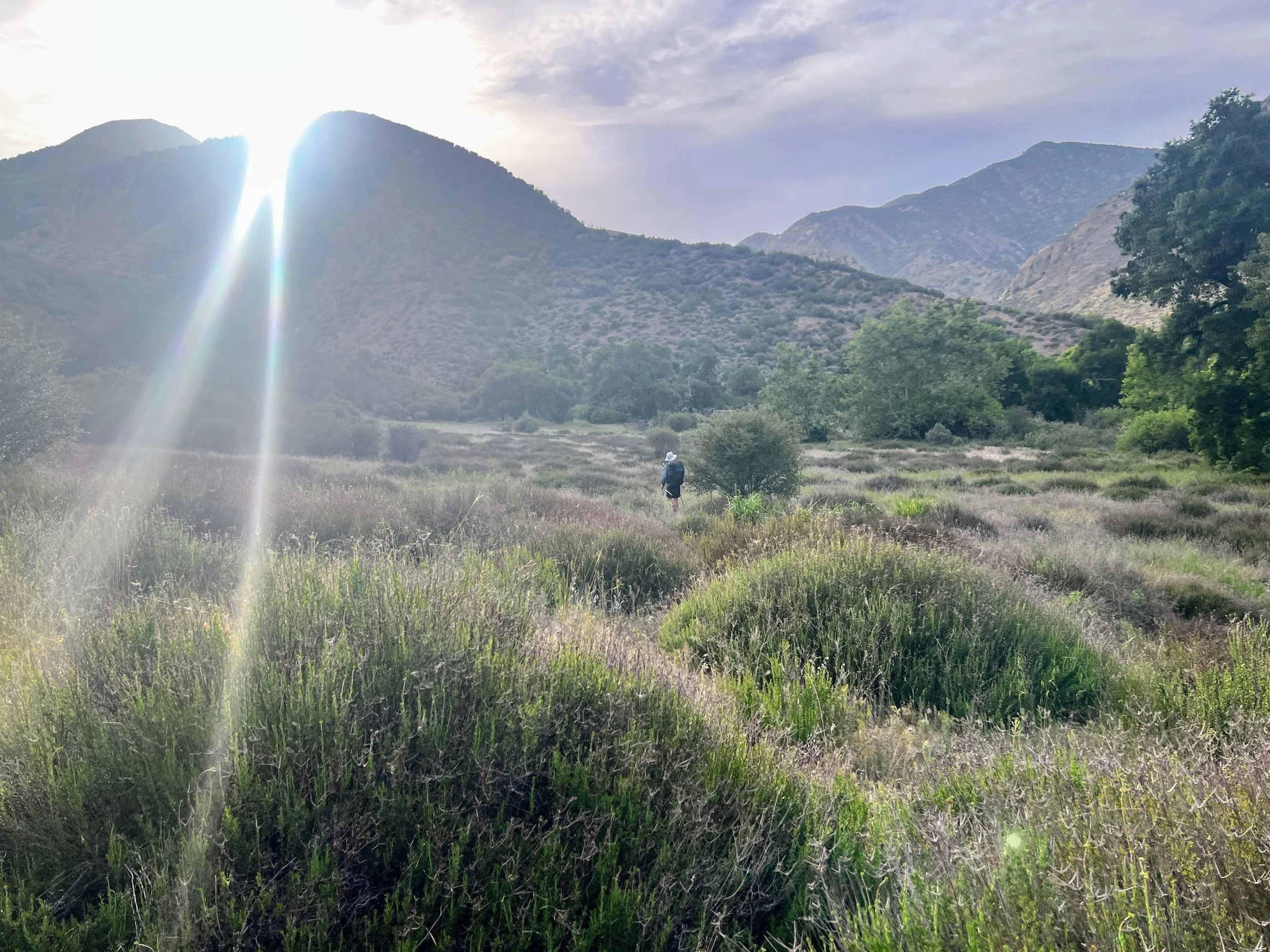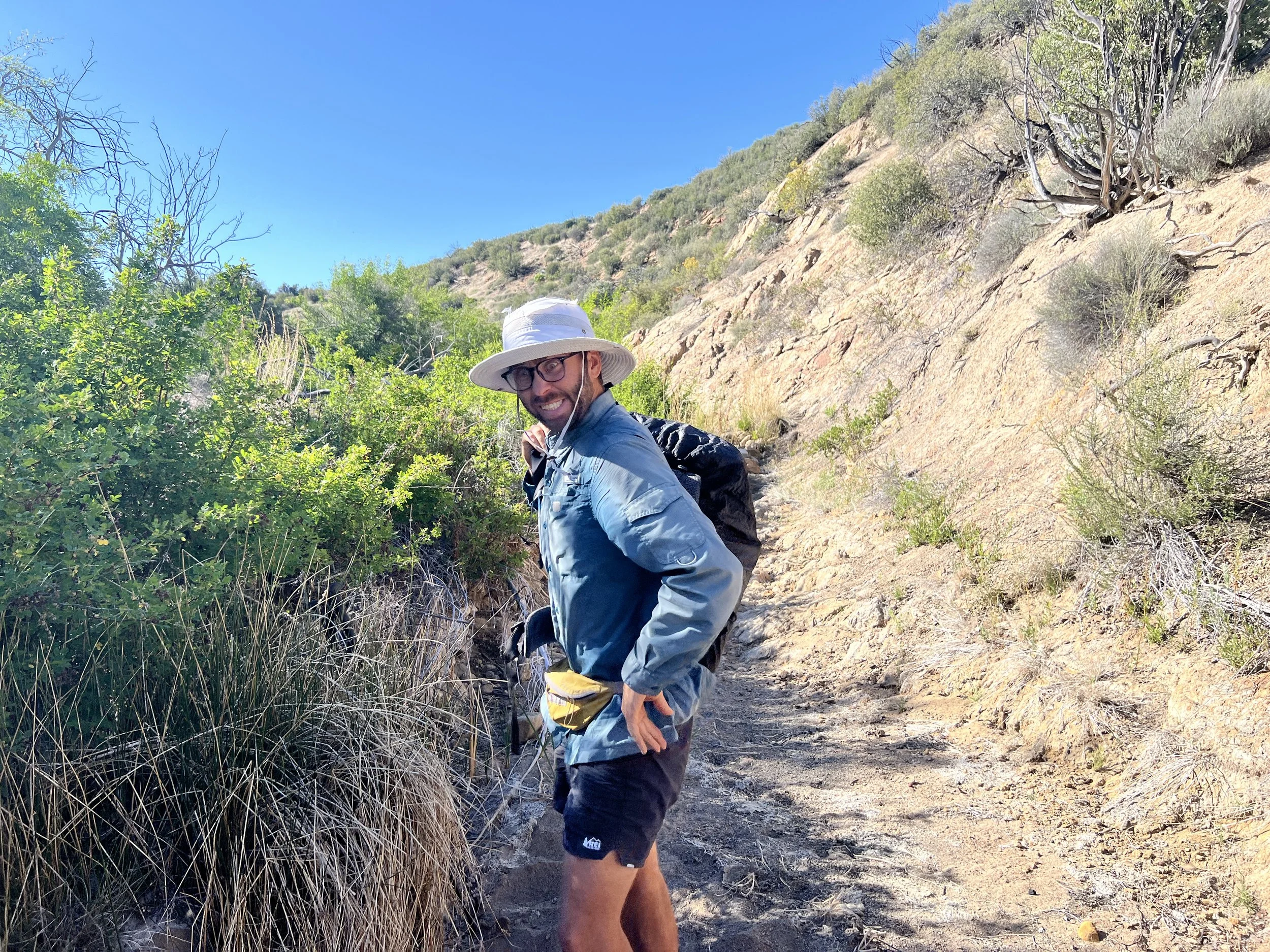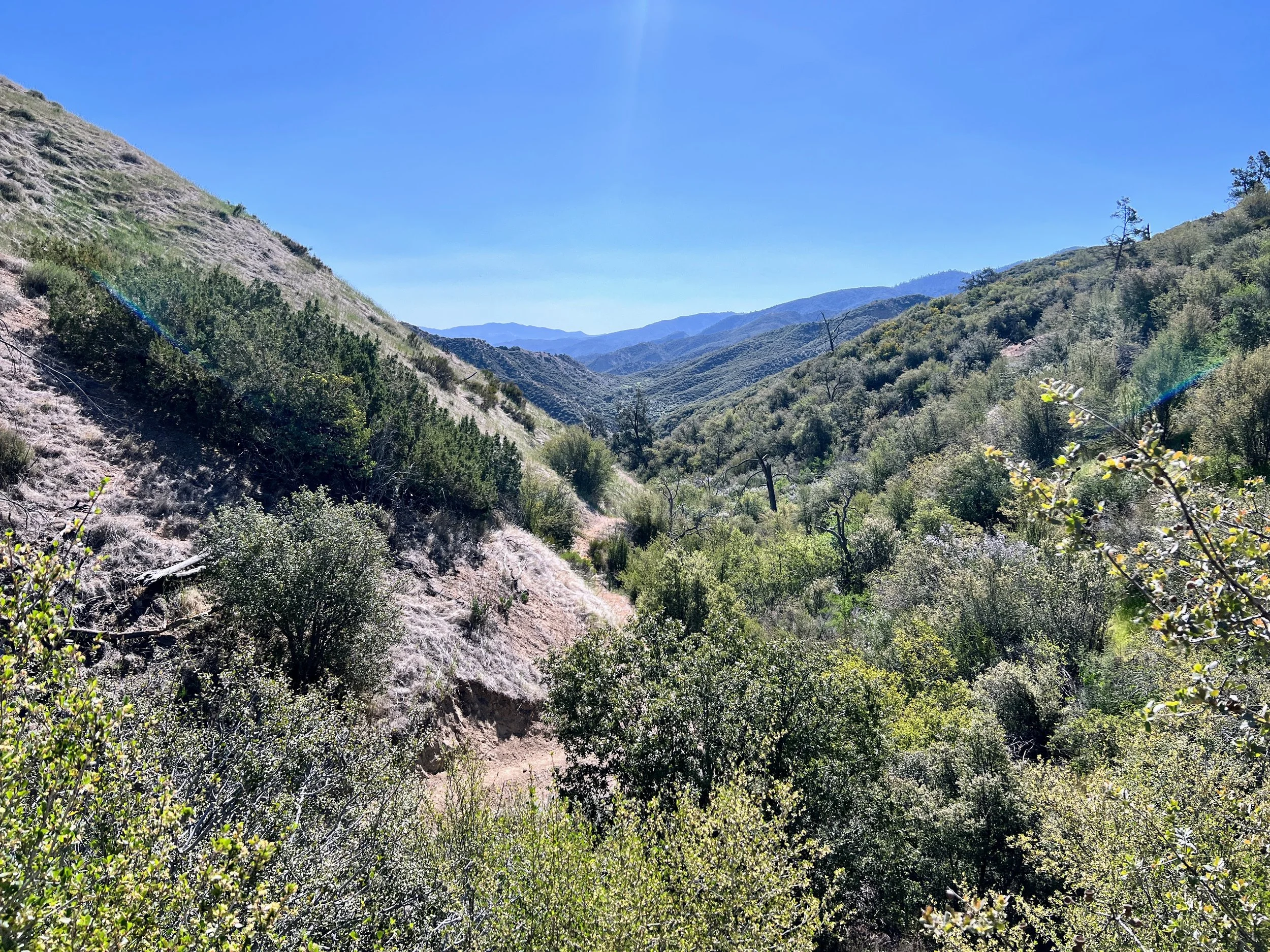 From the saddle we descend into Deal Canyon. I enjoy the presence of an actual trail, but I know not to get too attached; in true Condor Trail fashion, it eventually fades into a bushwhack. The clear path slowly narrows, the well-trodden dirt replaced by patches of tangled brush and scattered rocks. Branches scrape against my arms as I push forward, the scent of wild sage escaping the brush while chamise pollen scatters, dusting my face.