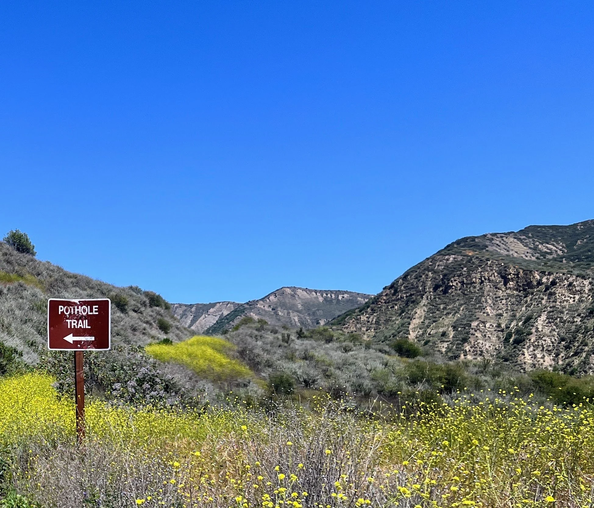 From the gatehouse, it’s about five miles on Piru Canyon Road to the Pothole Trail / Condor Trail trailhead. The parking area is a moderately sized dirt lot with a trail sign and a bathroom. We are the only car. We park, eat our burritos, and set off.