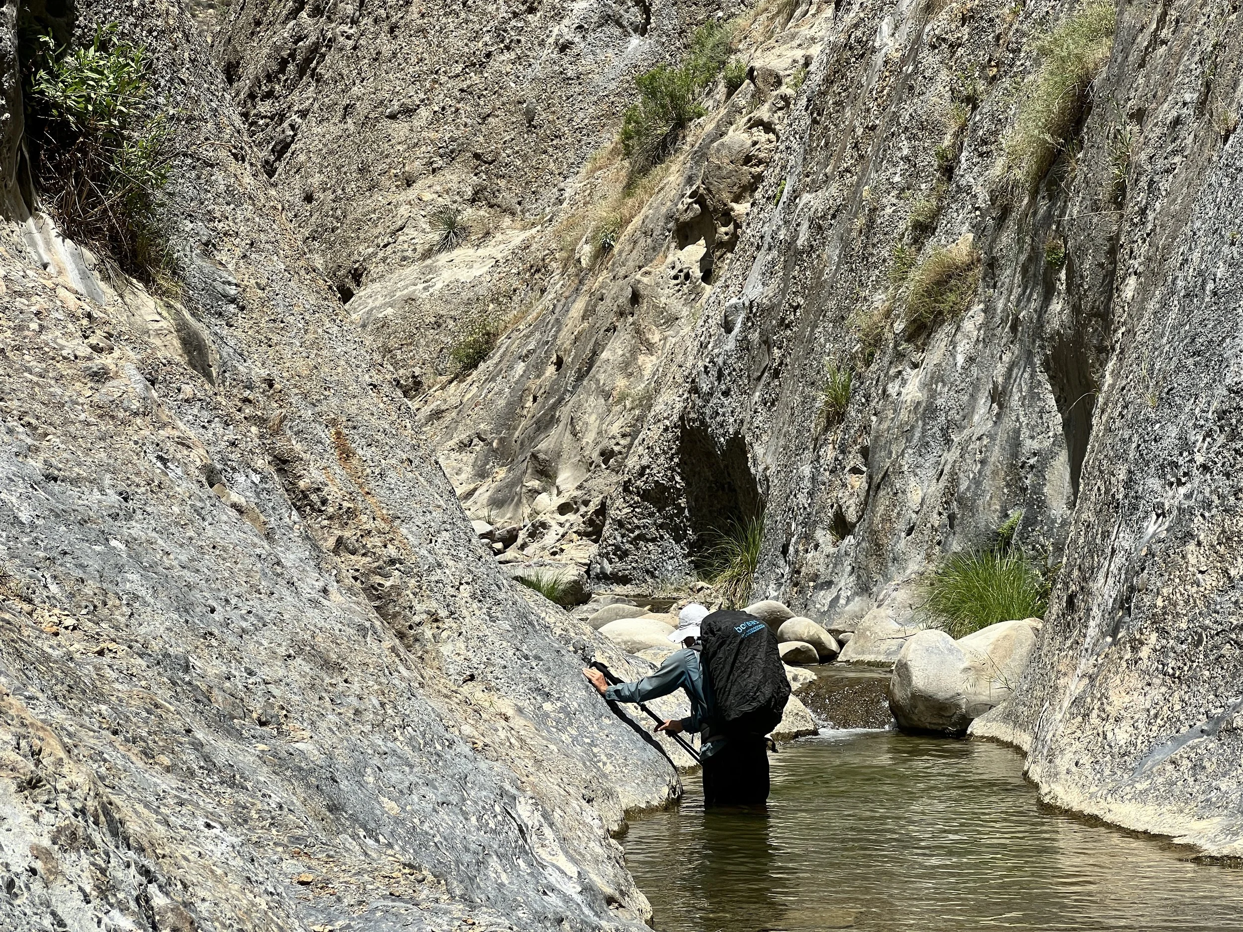 It comes as no surprise that the only practical way through this section is in the creek itself. We continue wading, splashing, and slogging through countless pools and cascades. Sometimes the water reaches only our shins; other times, it's chest-high. The footing is relentlessly tricky, slippery slabs, loose cobbles, and slick algae-covered rocks make every step uncertain. We scramble over smooth, wet boulders and feel our feet slide across uneven stones under the surface, constantly working to stay upright and keep moving.