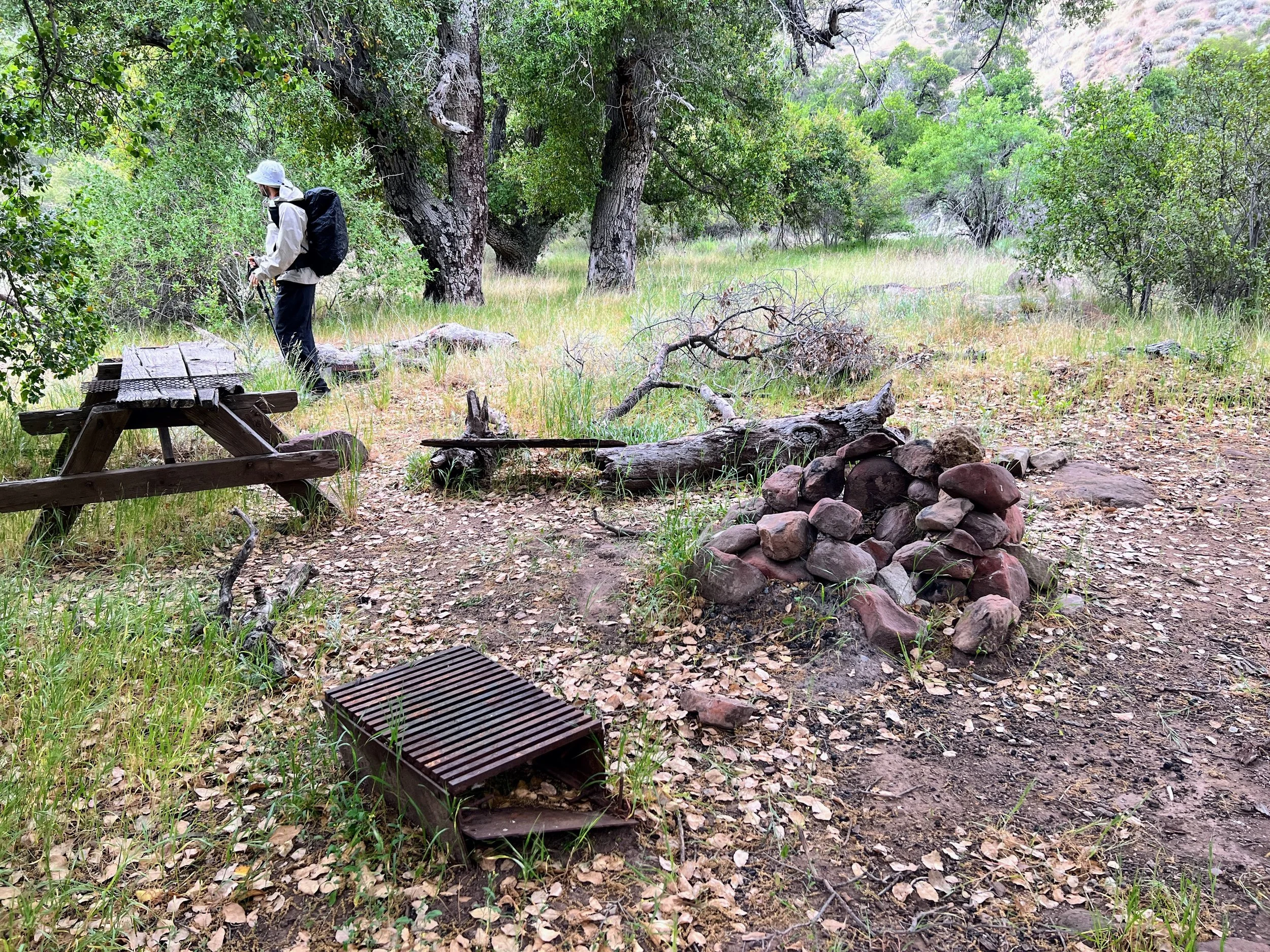 We finally reach the site and drop our packs in relief. Ant Camp is a quiet backcountry spot on a grassy bench above the south side of Agua Blanca Creek. A few non-poisonous oaks offer shade over a flat clearing with a well-used fire ring, makeshift benches, a picnic table (missing a slab but still functional), a rusty stove, and a shovel tucked behind a tree. Camps like this are common in Los Padres, where trail crews, hunters, and longtime users have left behind tools and infrastructure for shared use over the years. It’s just a flat spot near the river, nothing special, but it feels like a victory.