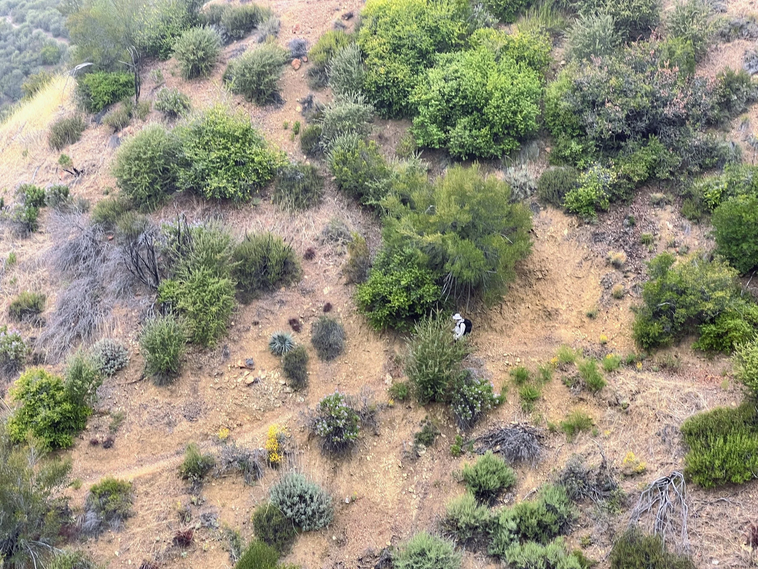 The trail is unmaintained, sometimes nonexistent, and steep. I stop a few times to catch my breath and look back. The higher we climb, the smaller Lake Piru appears behind us, while the landscape stretches wider and more vast. I spot a black bird soaring overhead and pull out my monocular. A condor on day one?!