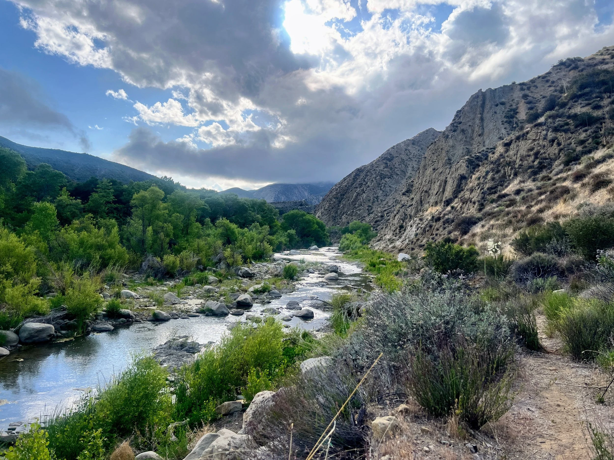 The trail eventually drops to Agua Blanca Creek, which flows clear and cool, winding through a shaded canyon lined with oak and sycamore trees. Its rocky bed forms small pools and gentle riffles, surrounded by lush vegetation that sharply contrasts with the dry hills above.