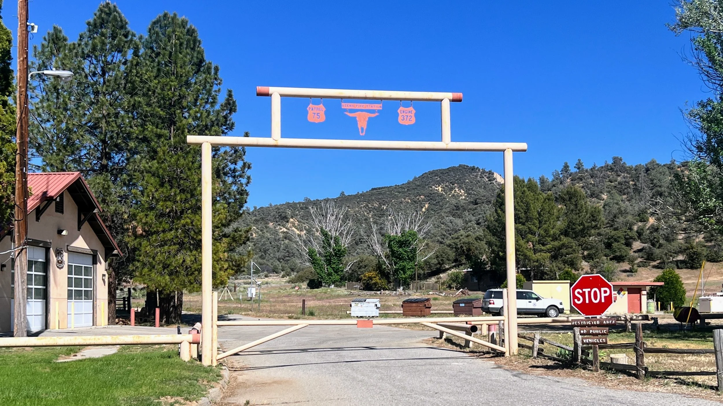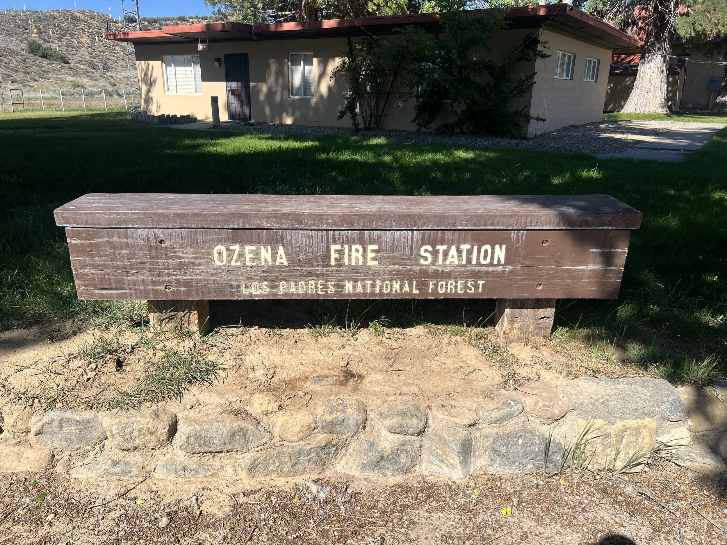 We reach Ozena USFS Fire Station, a modest outpost tucked into the valley. It’s right off Highway 33, but there’s little traffic, and no one seems to be here. The first thing we notice: trash cans. We gratefully toss our trash bags, freeing up a little space in our side pockets.