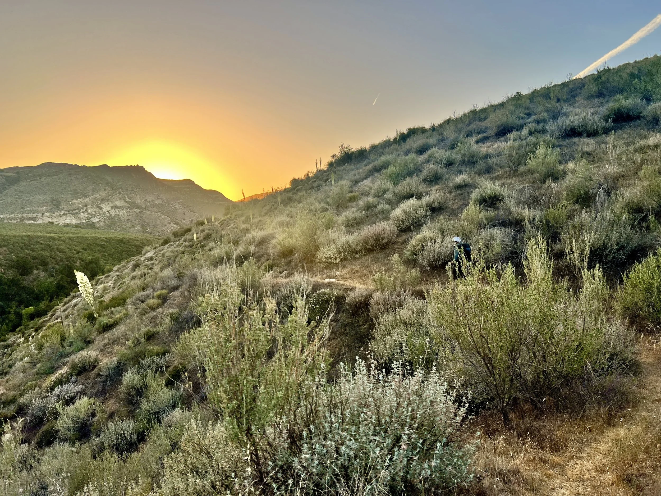 As we drive, the officer asks about the trail and shares some of his favorite spots in Los Padres. I nod along, but my gaze stays fixed on the window. The landscape shifts, the valley opens, low mountains glowing gold and red in the sunset. The road winds through oak-studded hills and wide grassy fields, the whole scene drenched in warm light. I catch faint whiffs of salty ocean air, and for once, I’m happy to be behind a window, separated from nature, instead of clawing through brush and poison oak.