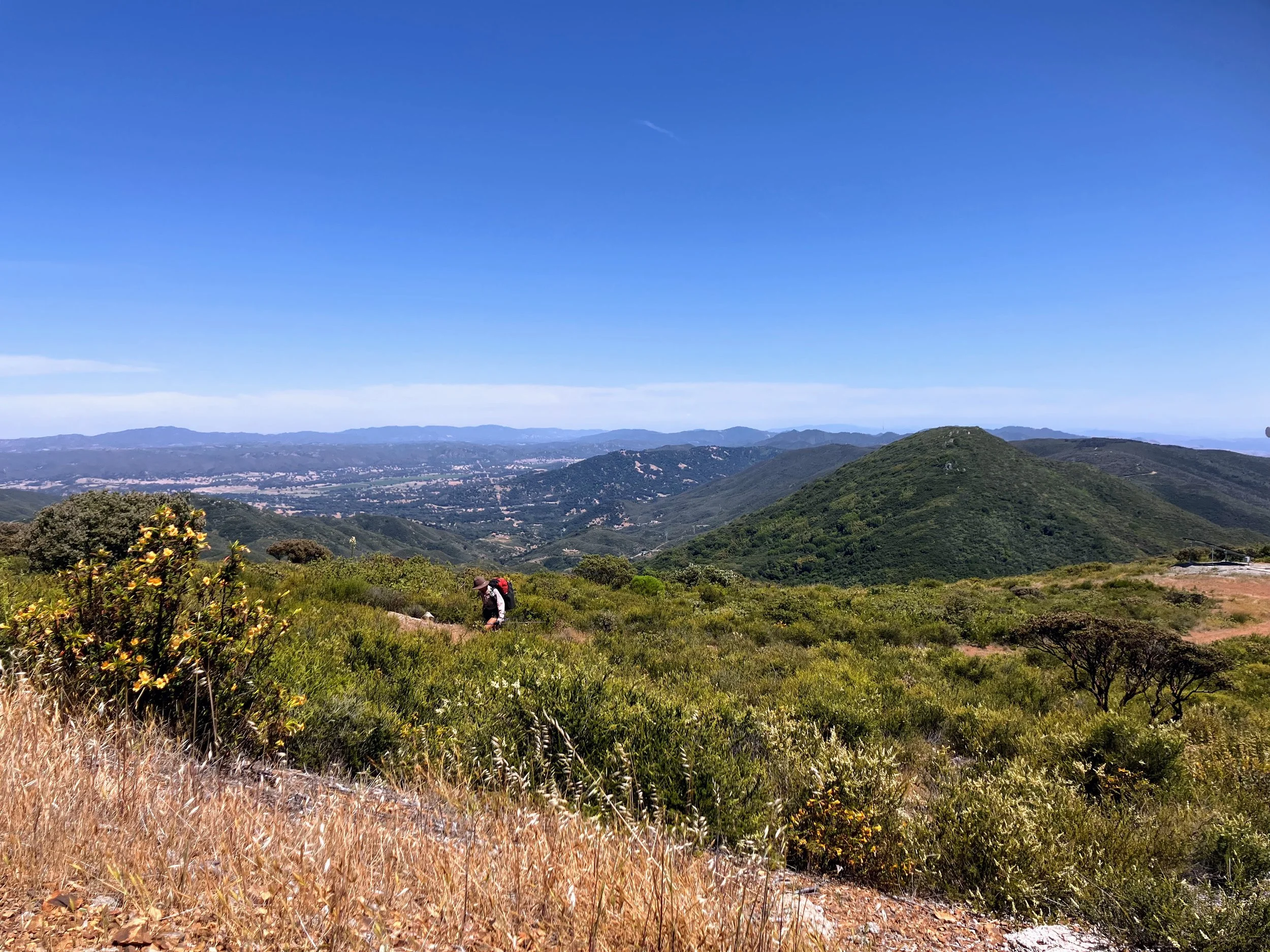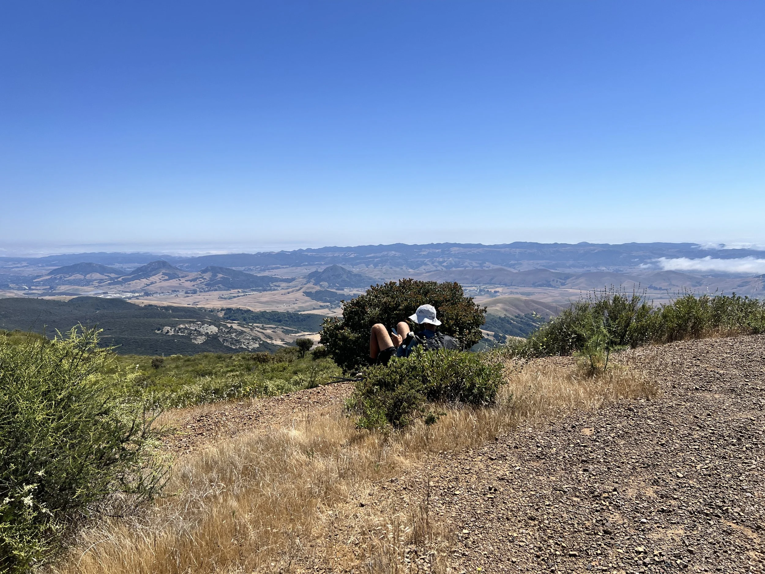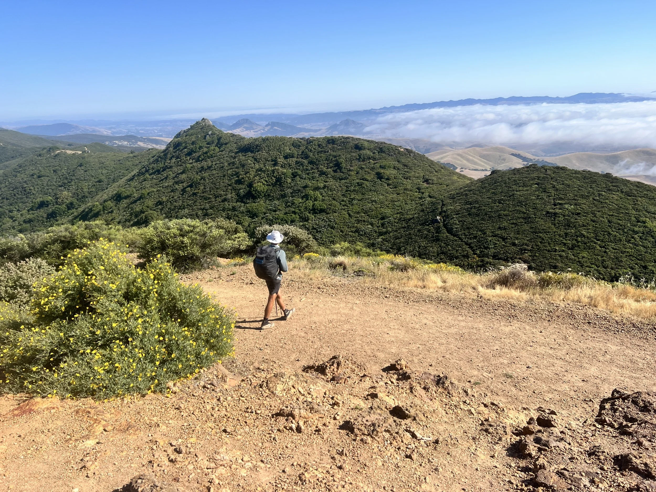 We follow TV Tower Road, a graded dirt track that climbs, dips, and winds along a ridge. The terrain is exposed, with no shade. From the road, views stretch wide, valleys dotted with chaparral, distant coastal peaks, and the ever-present ocean fog inching into the valleys. The hum of traffic fades as we climb, but we’re far from isolated. We pass car campers, trail runners, and mountain bikers who barely notice us. It’s nice to be on a dirt road with the cool ocean breeze, and I even take advantage of the good cell service and open terrain to call my dad as I hike, checking in and sharing a bit of the trail with him.
