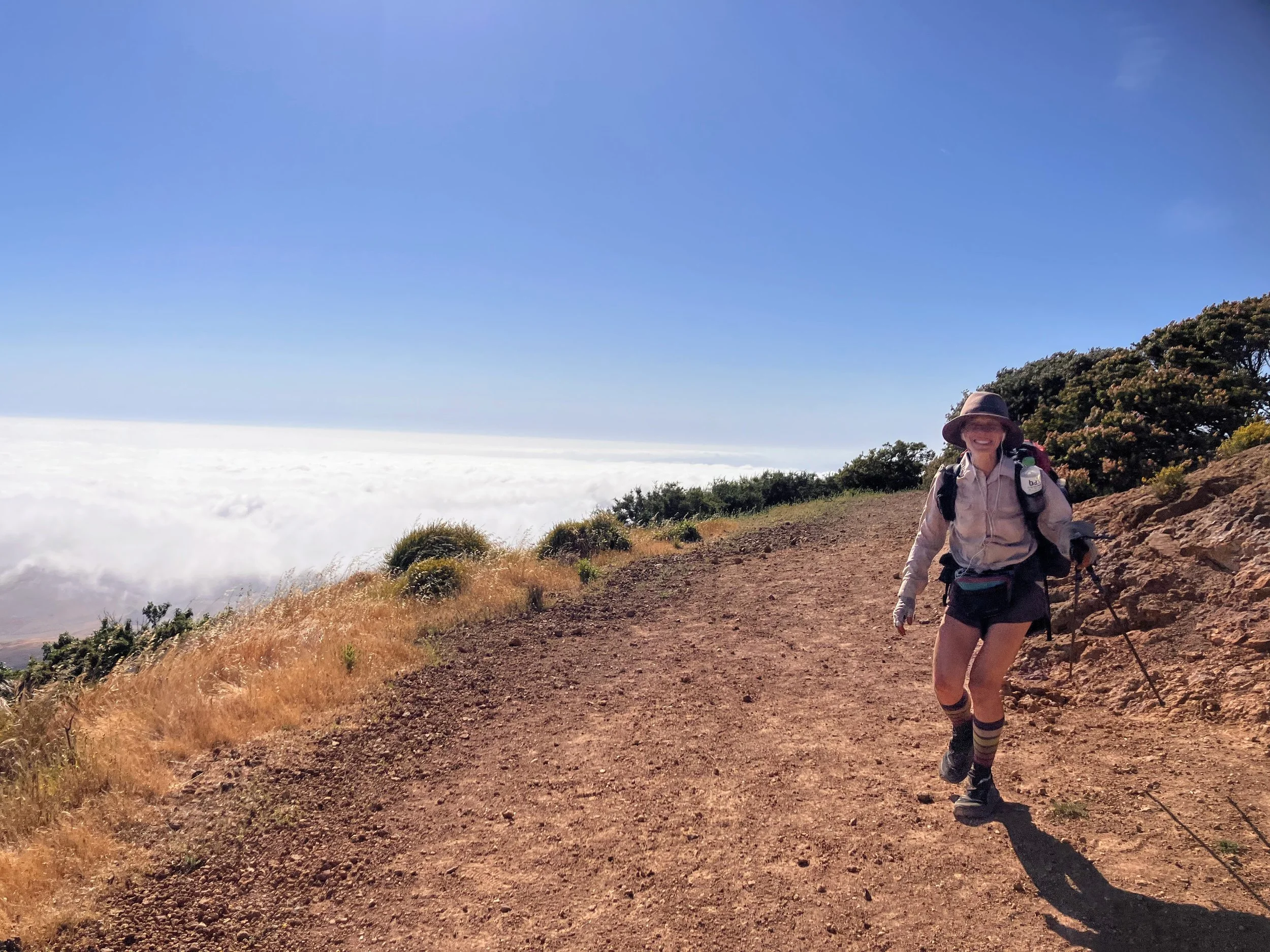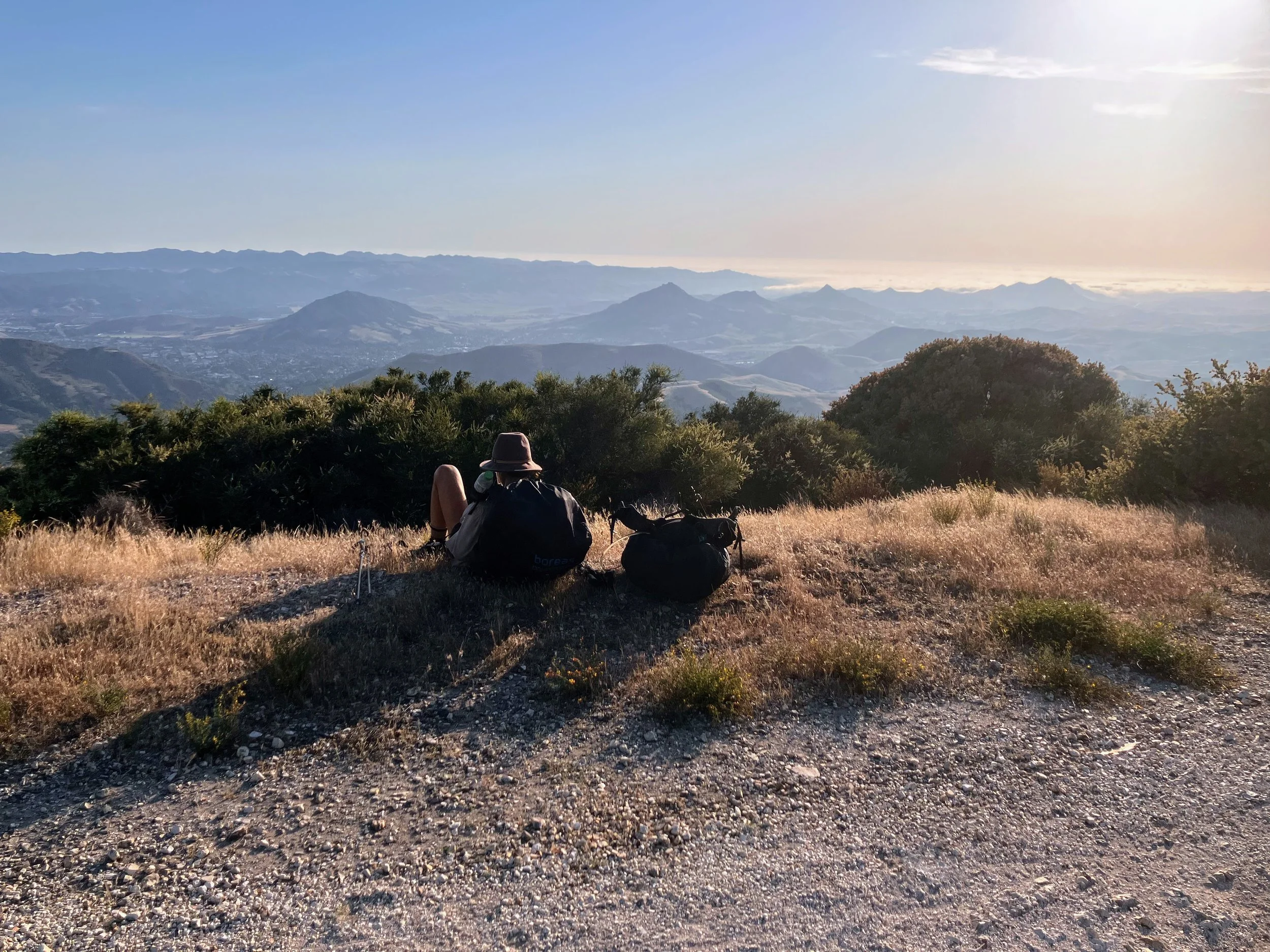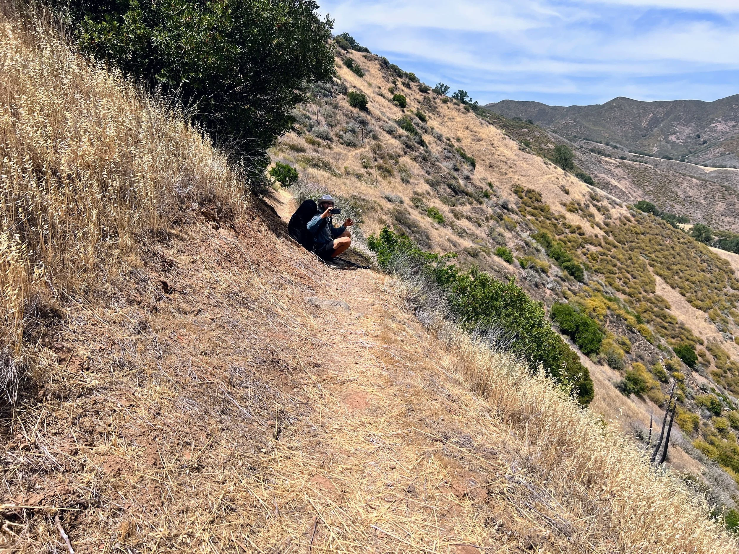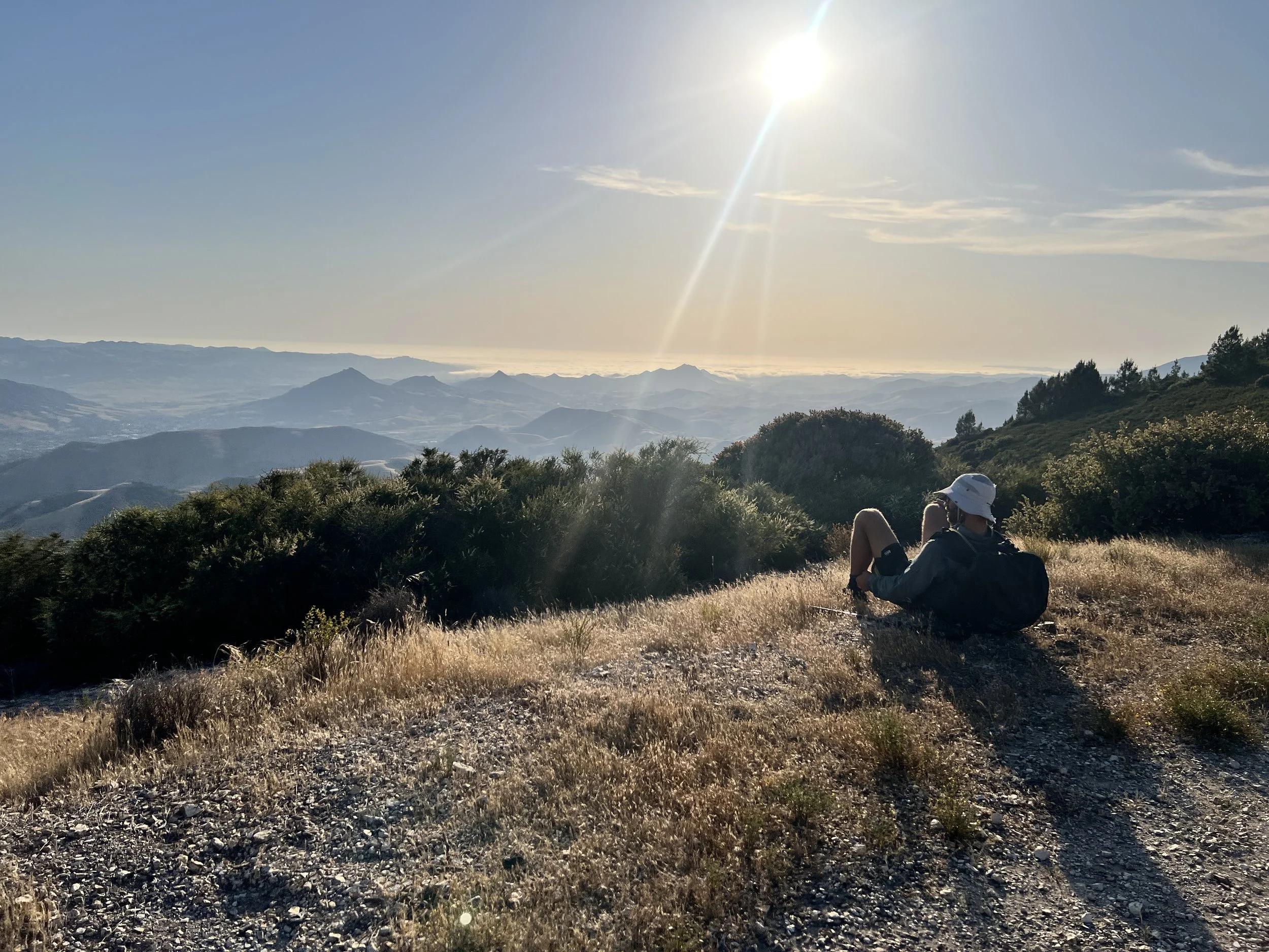 We follow TV Tower Road, a graded dirt track that climbs, dips, and winds along a ridge. The terrain is exposed, with no shade. From the road, views stretch wide, valleys dotted with chaparral, distant coastal peaks, and the ever-present ocean fog inching into the valleys. The hum of traffic fades as we climb, but we’re far from isolated. We pass car campers, trail runners, and mountain bikers who barely notice us. It’s nice to be on a dirt road with the cool ocean breeze, and I even take advantage of the good cell service and open terrain to call my dad as I hike, checking in and sharing a bit of the trail with him.