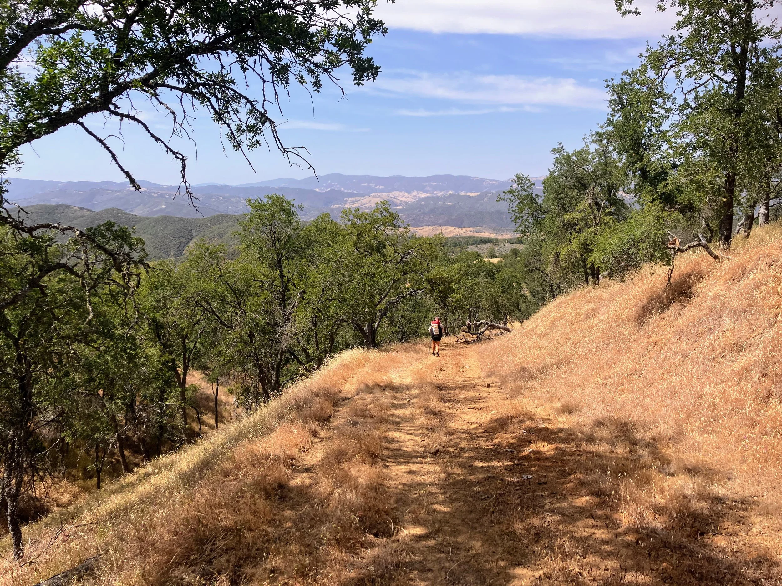 I imagine these hillsides must be stunning earlier in spring, bursting with colorful wildflowers. For now, the views are still nice, but in that sun-baked, faded kind of way. The hills wear a dry coat of brittle shrubs and faded grasses. Still, I’m not slogging through a creek, and I’m actually on a trail I can see. I’ll take the win.