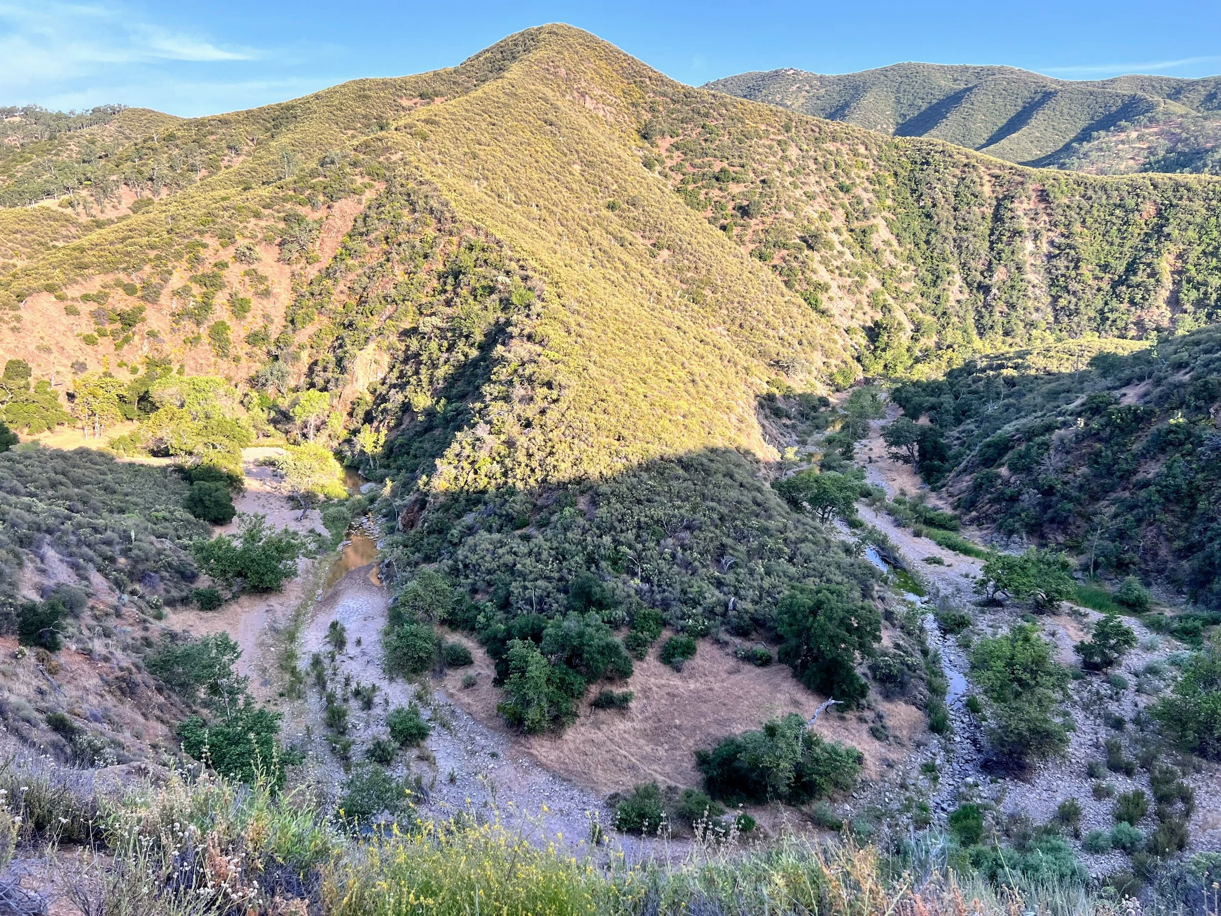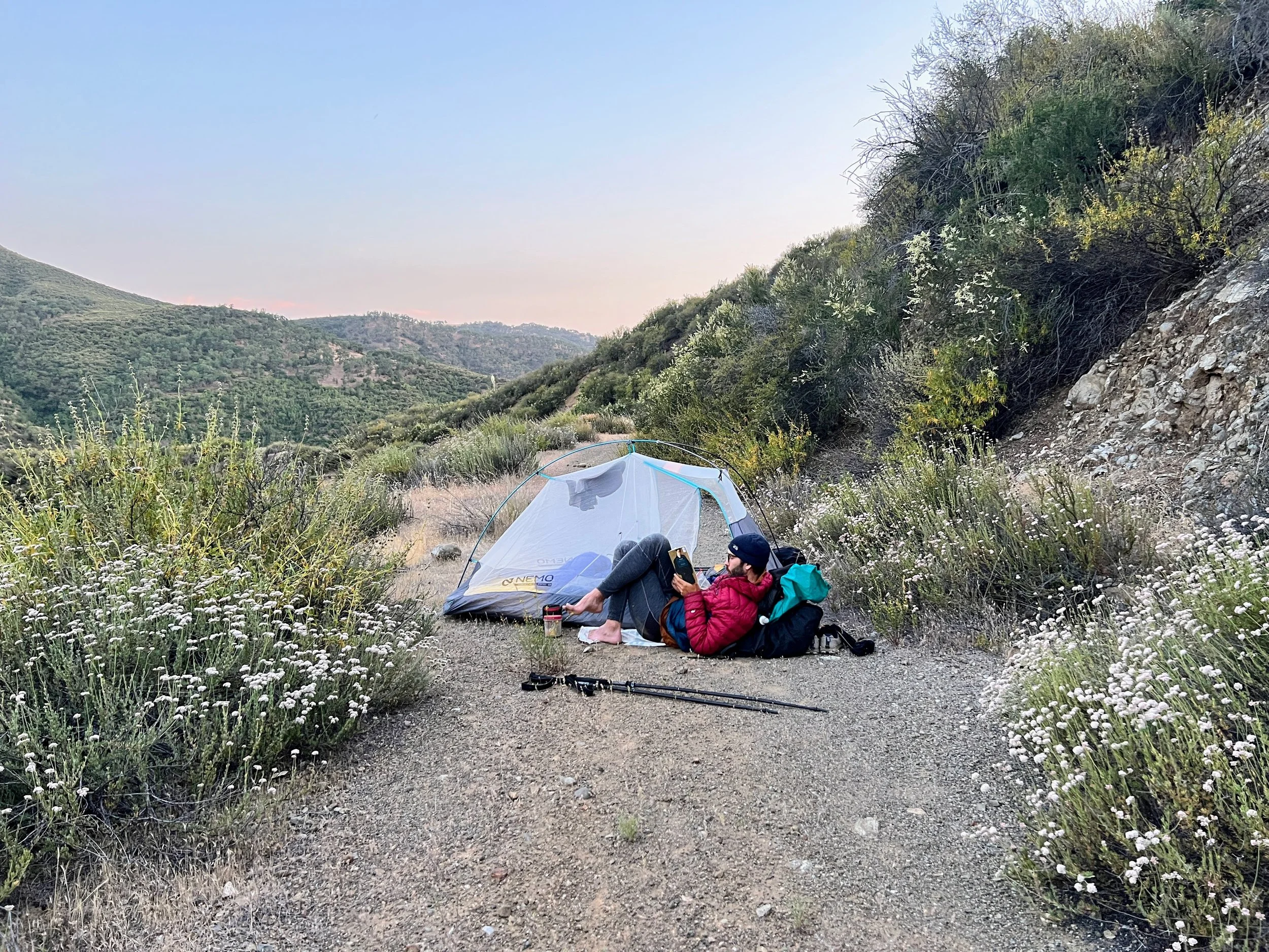 We keep climbing and camp at Upper Big Falls trailhead, in an open spot off the road. It feels good to finally be out of the poison oak and dark forest. The views here at the edge of Lopez Canyon are fantastic. Apprehension remains, as we’ll descend into the canyon first thing tomorrow, where we’ve heard recent reports of rough bushwhacking and boundless poison oak.