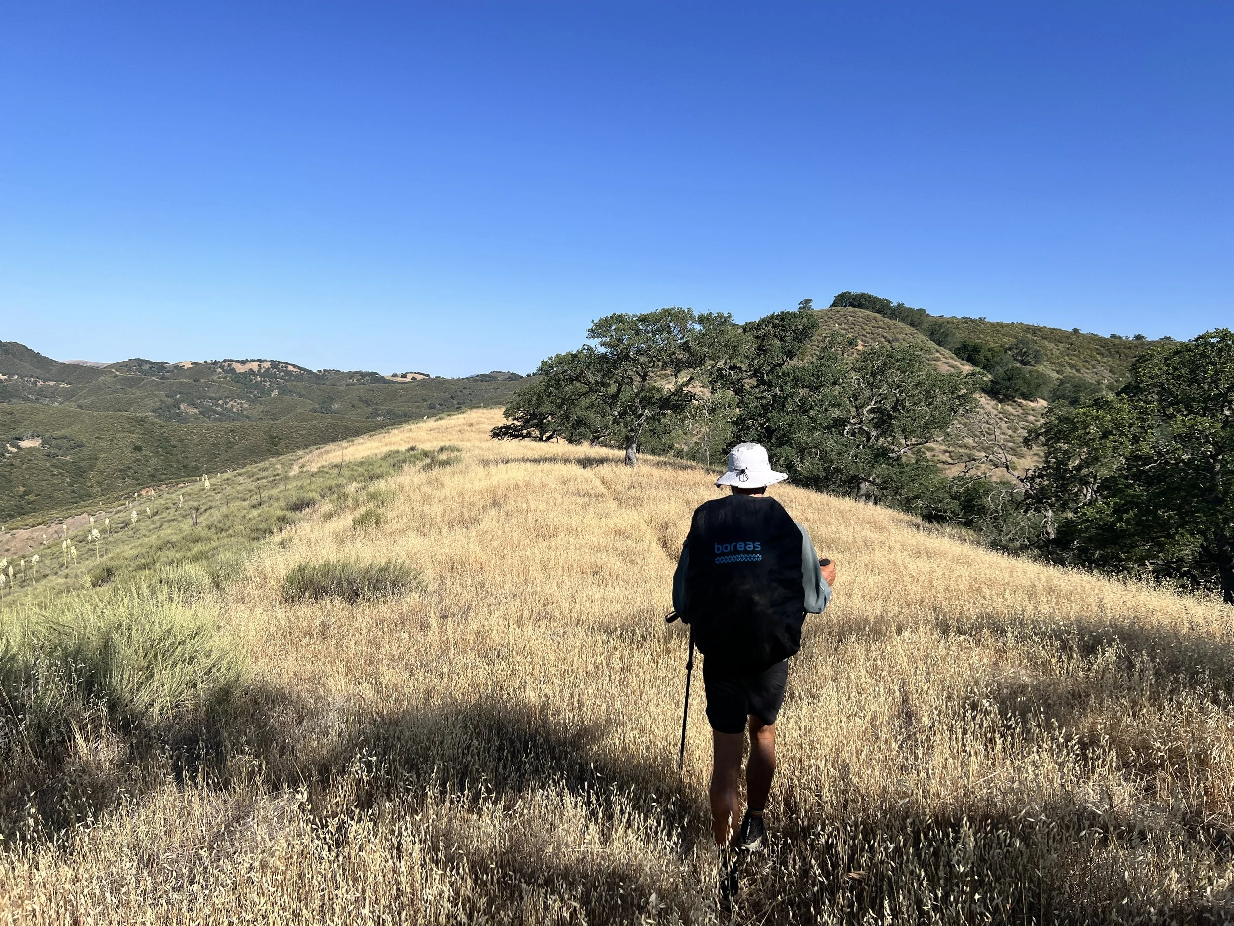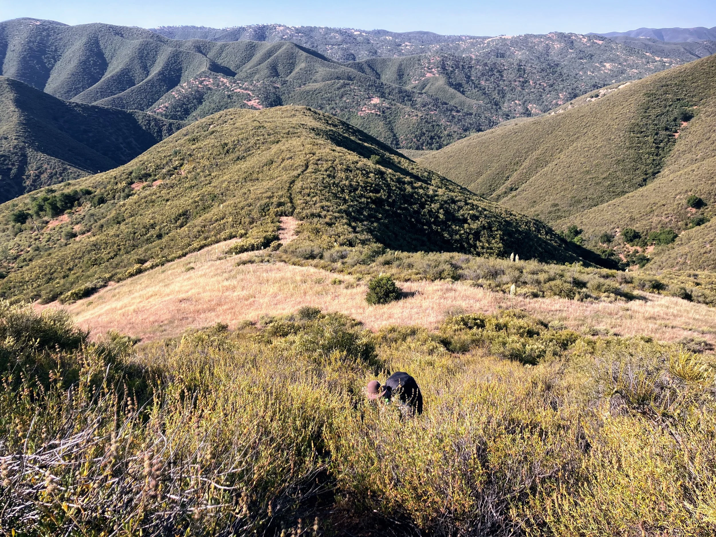 We follow the ridgeline with views of mountain peaks and green and golden hillsides. For once, there’s no intense bushwhack, but that doesn’t mean it’s easy. The climbs are steep, the sun unrelenting, and the old firebreak is loose and rocky. My Altras are worn down, offering almost no traction. I slip a few times on the uneven slope that, at its steepest, feels like walking up a tilted hill of marbles.
