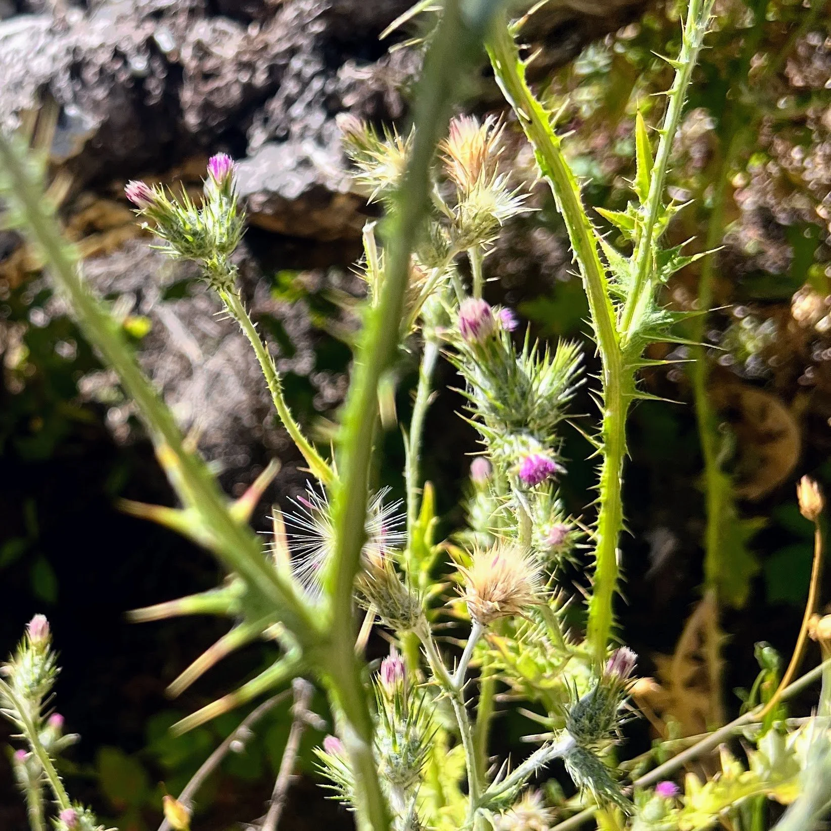 When we finally get moving, the trail is a narrow single track overgrown on both sides, poison oak on one, sharp and sharper thistle on the other.