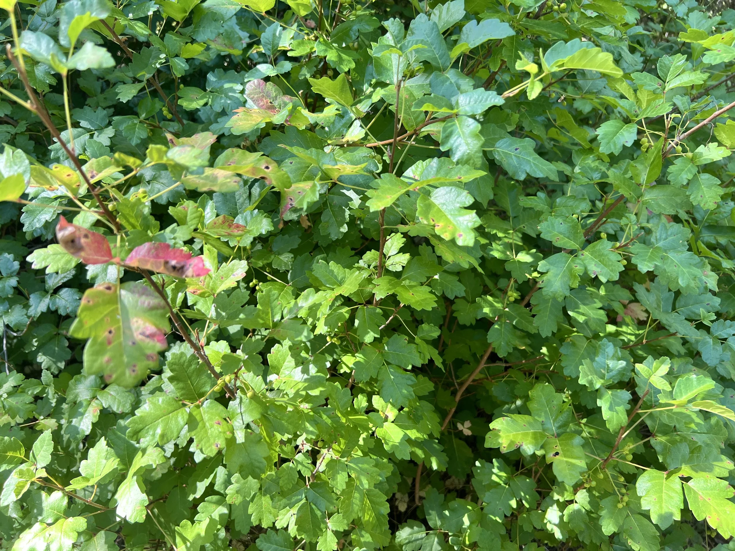 Poison oak becomes unavoidable. Pockets of it appear like ambushes every few hundred feet. We squeeze past, twist, step over, and climb around, packs brushing leaves that threaten to mark us, slowing every step to a cautious crawl.