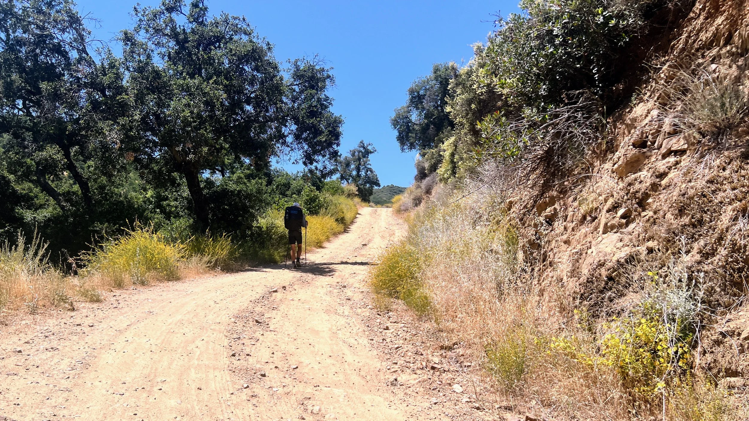 As we approach Lopez Canyon Road, we spot people for the first time in days, college students in swimsuits, heading toward the water. The contrast of their bare skin to our grimy, fully covered layers is stark. They brush past us, laughing loudly, unconcerned by the oak we’ve been carefully dodging.