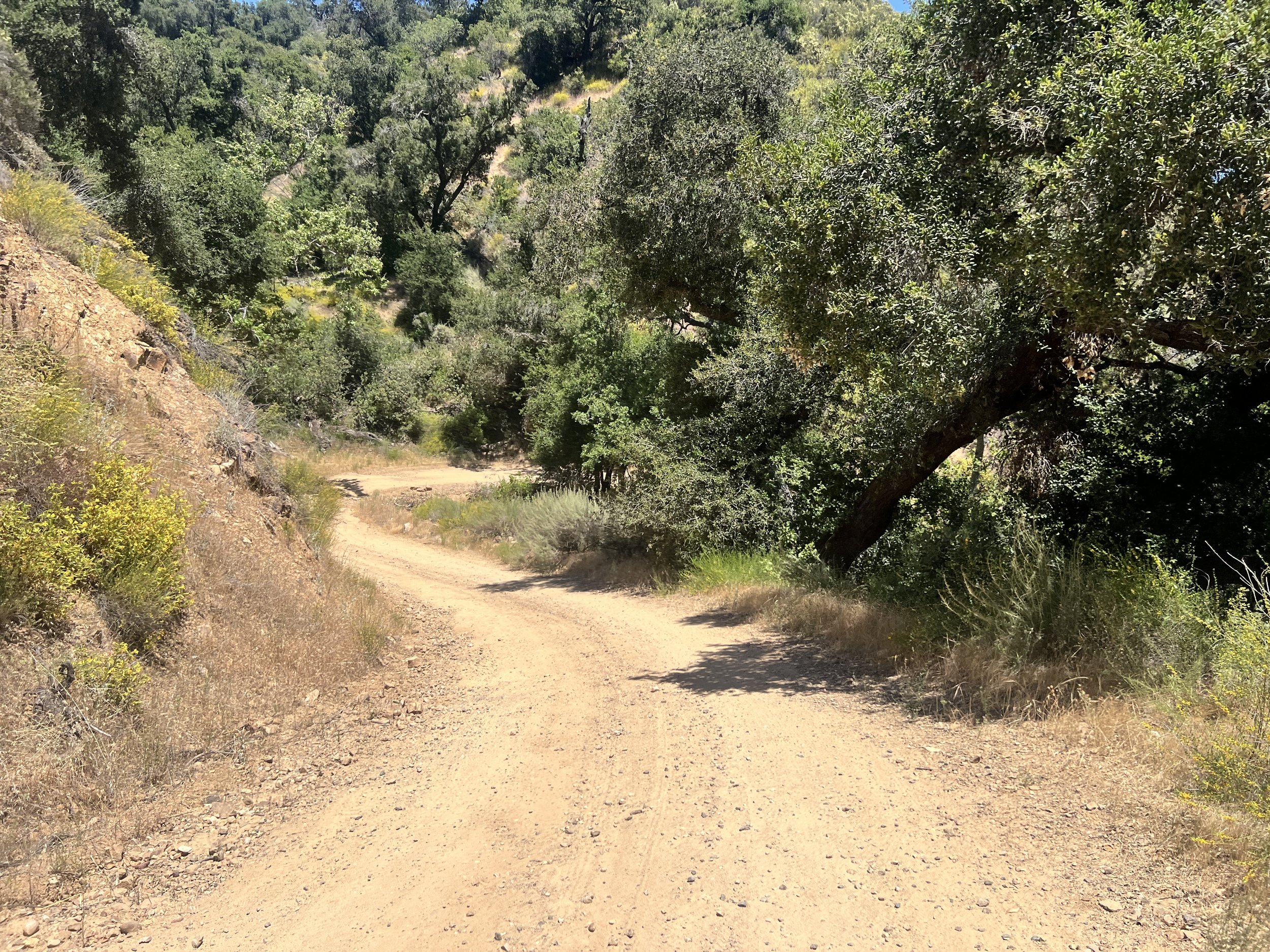 The trail winds through a short ravine lined with oaks and sycamores before climbing up to a semi-overgrown ridge road.