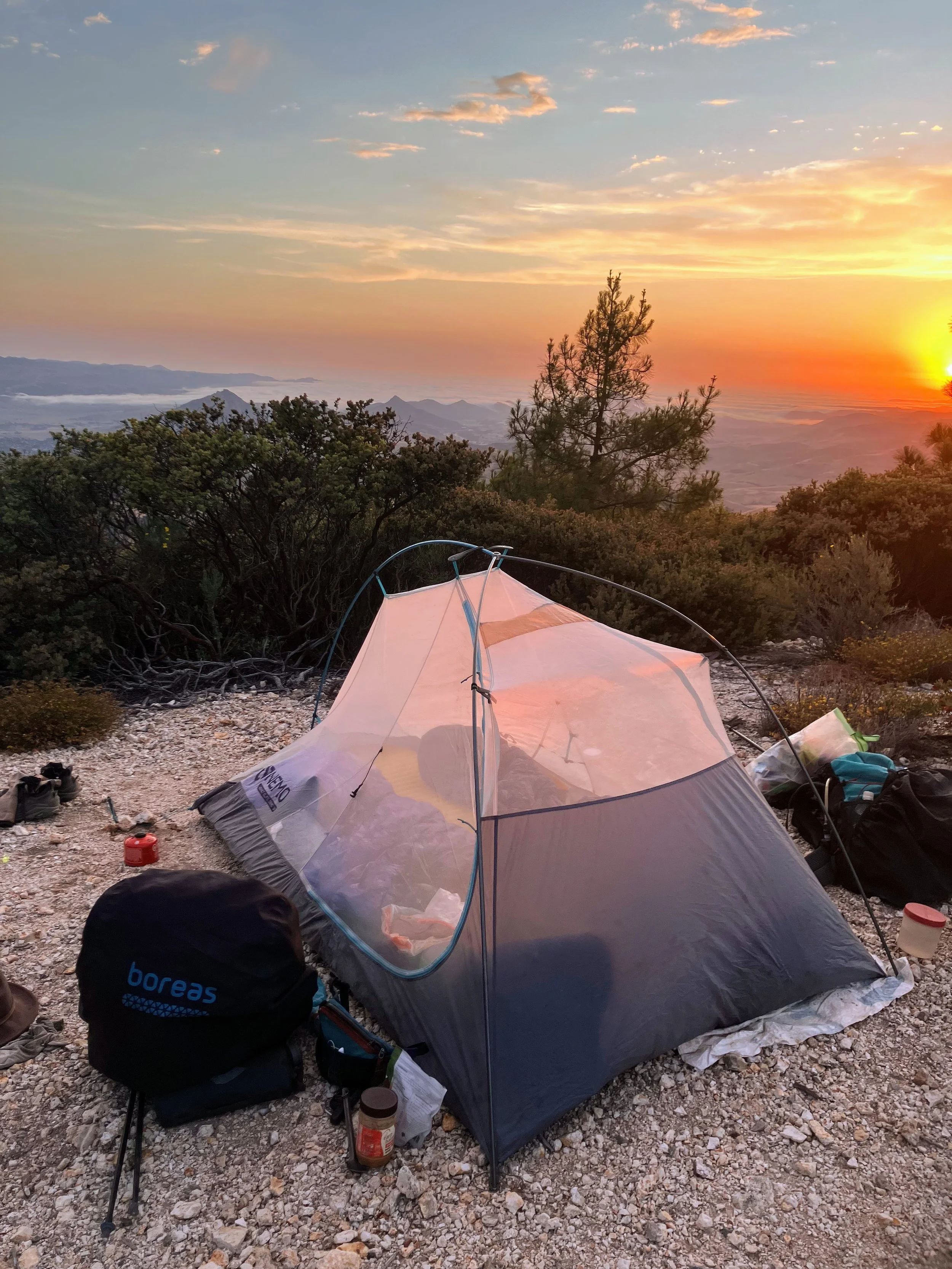 We hike until evening and set up camp on a dirt road overlooking a small valley. The air cools and the valley stretches wide below us. It’s quiet here, peaceful enough to finally catch our breath.